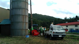 牛舎の屋根から落ちた雪で